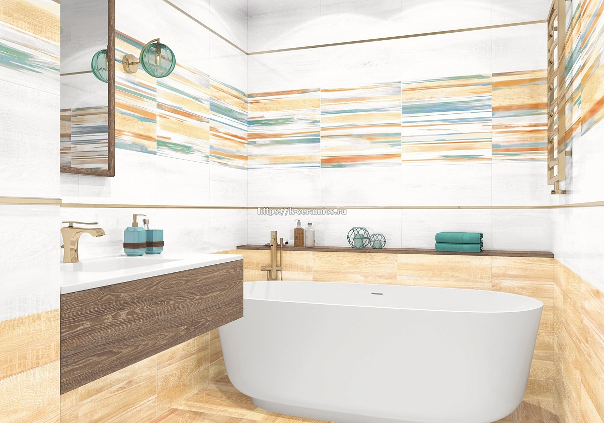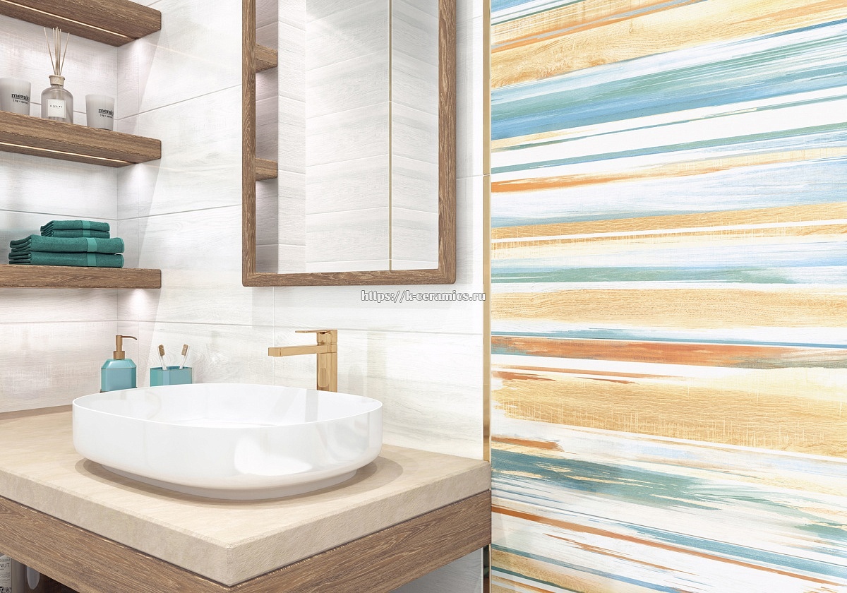 Коллекция Briole - это комбинация текстуры дерева с яркими цветами. Декоративная панель с эффектными цветными мазками краски поможет создать уникальный дизайн. Эта коллекция продолжается керамическими бордюрами в золотом и платиновых исполнениях. Плитка формата 249x500 мм с глянцевой поверхностью - нестандартное решение для интерьера. Керамогранит для пола классического формата 410x410 мм удобен в использовании и дополняет композицию.