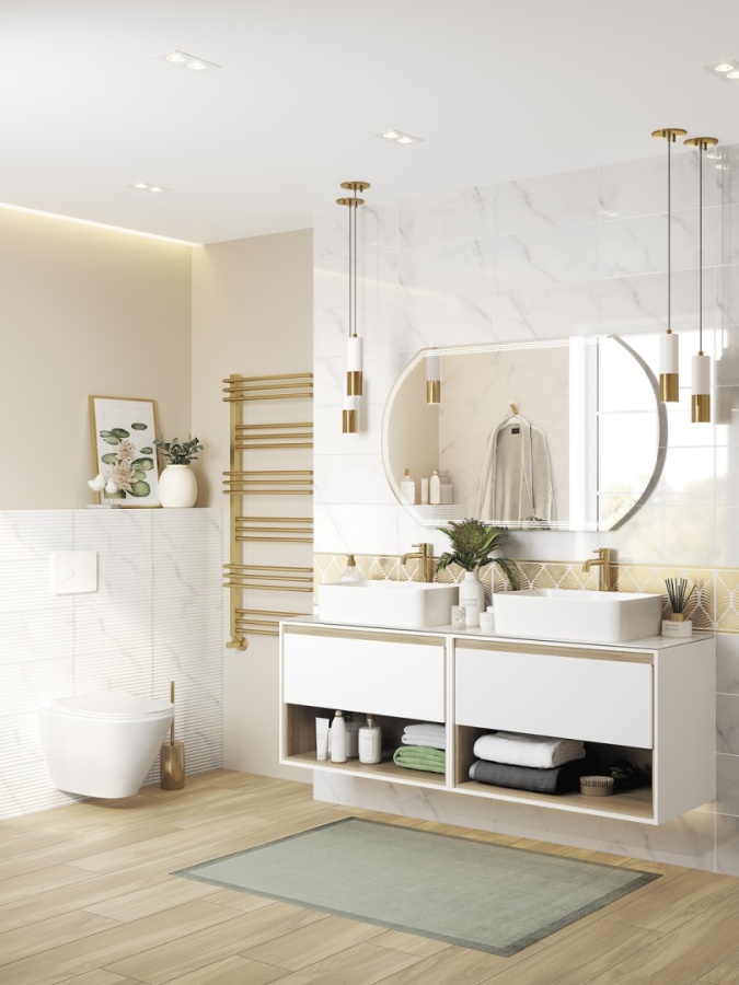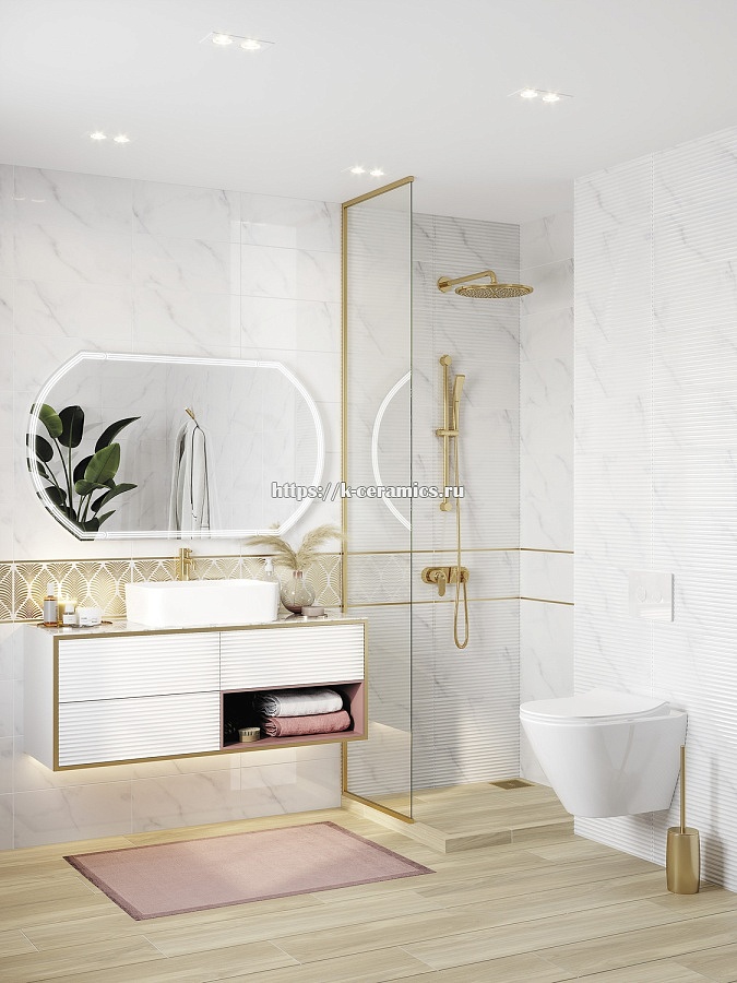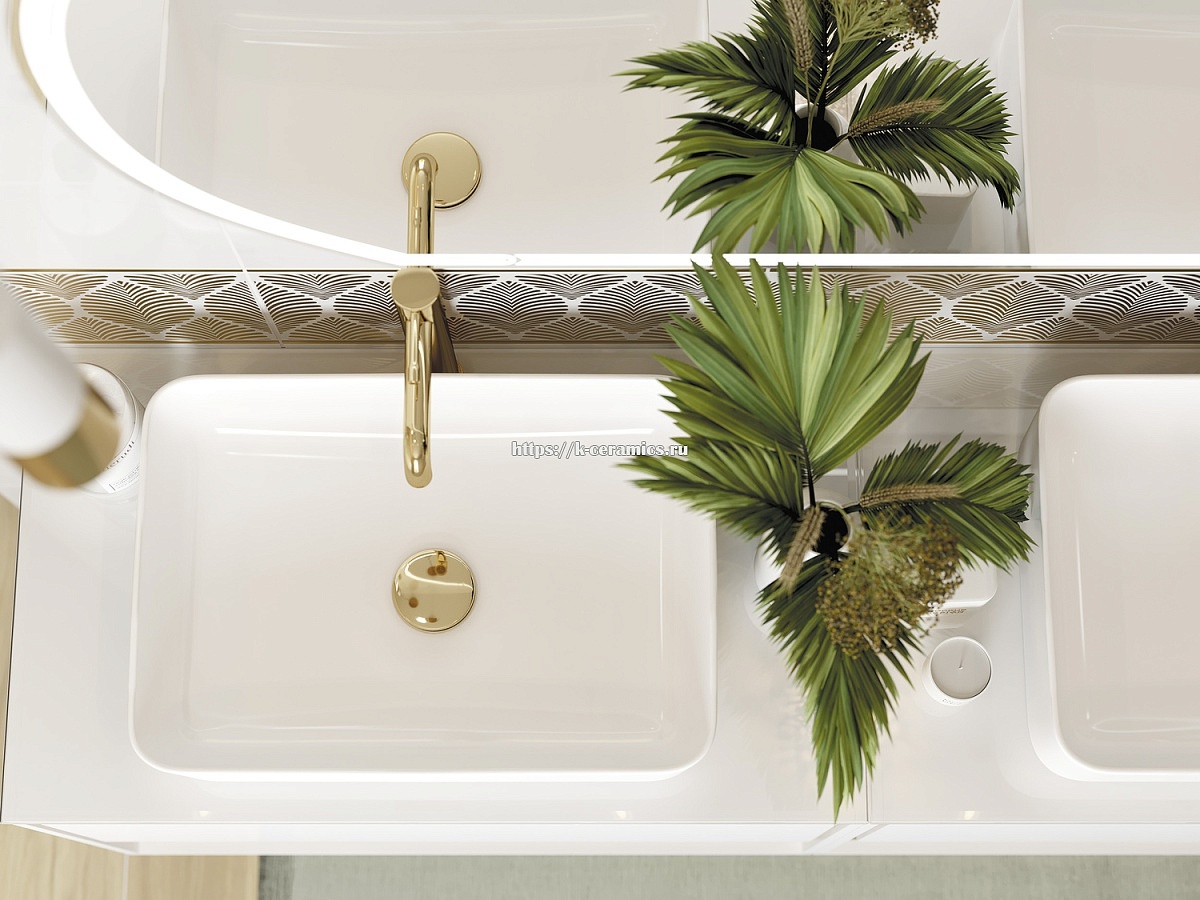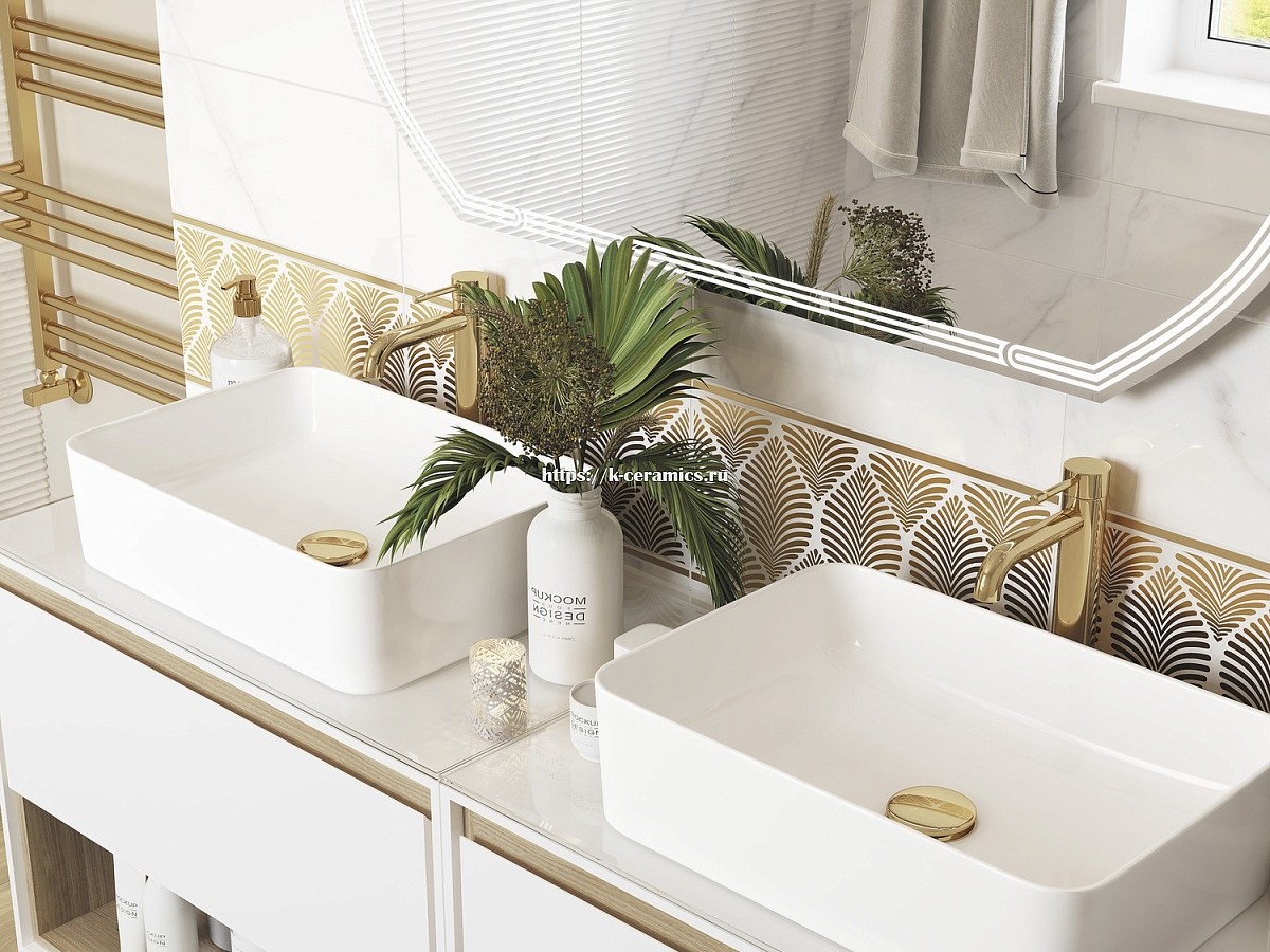 Естественная красота натурального мрамора в коллекции Omnia представляет собой современную классику в интерьере. Эта универсальная белая плитка с тщательно проработанными прожилками прекрасно отражает свет, зрительно расширяя пространство. Волнообразный узор выполнен с использованием сверкающего золота и стыкуется в любом направлении, позволяя оформлять большие пространства. Золотистый металлический бордюр с намеренно подчеркнутыми потертостями акцентирует изысканность декоративного элемента, при необходимости разделяя пространство. Лаконичный рельефный узор с повторяющимися полосами, напоминая греческие мраморные колонны, подчеркивает античный стиль. Напольные плитки под белый мрамор поддерживают эксклюзивный стиль, в то время как керамогранит под дерево добавляет интерьеру уюта. Комбинируйте эти два приема в одном пространстве для визуального разделения зон независимо от размера помещения.